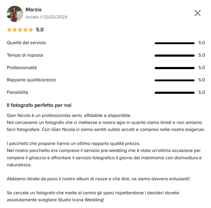 I nostri clienti condividono con il cuore le loro esperienze con me e lo staff. Le loro parole riflettono la dedizione e la cura che mettiamo in ogni matrimonio. Leggi gli estratti qui sotto o tutte le recensioni da matrimonio punto com: